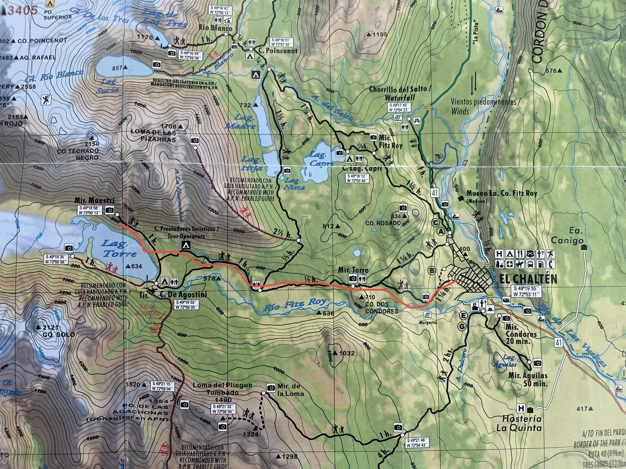 Your first stop in El Chaltén should be at the park ranger station, where you can get all the information you need about hikes in the area. There is also an interpretive garden of native plants, each labeled with common and scientific names and other information. At the ranger station you can also learn about the wildlife common in the area and the best places to spot them. The most popular is the huemul, a small deer endemic to the area. Unfortunately, there aren’t many left and I didn’t see one during my week there. However, I did spot several wild hares, foxes and lots of birds. The other important piece of information I got was that you can drink the water just about anywhere near the glaciers. On every trail I found springs to fill my water bottle and even drank directly from a few glacial streams. Below are the trail maps for the hikes I went on.