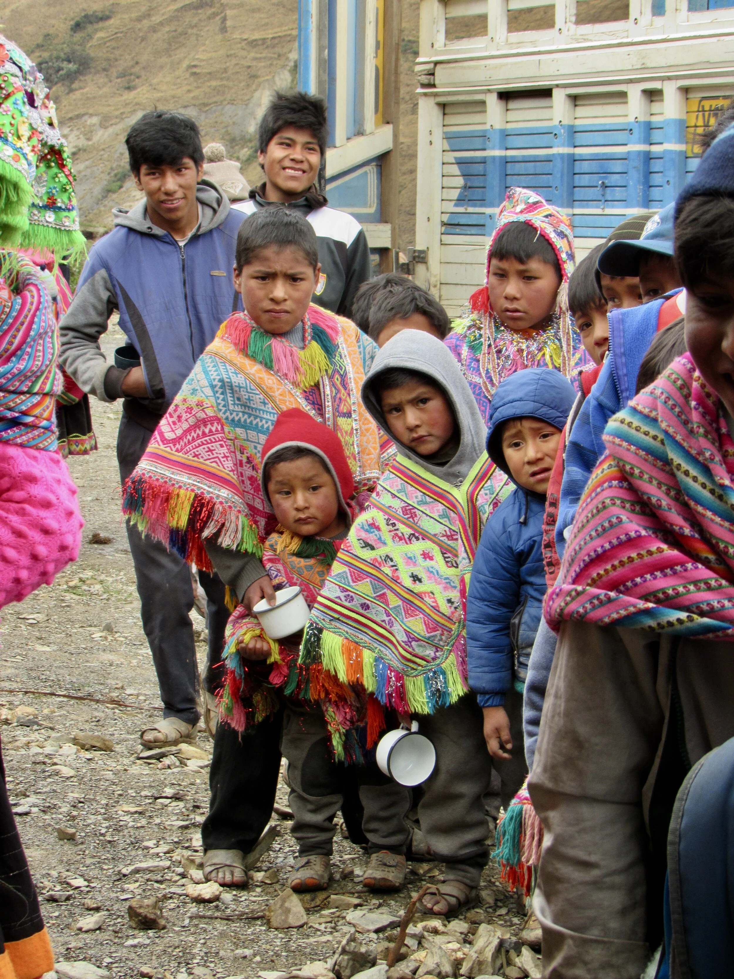 When we got to the second stop, Airepampa, Elio informed us that this would be the only other stop, so we handed over all of the remaining milk, sugar, cloves, cinnamon and bricks of cacao. This time we distributed the clothes first, which probably worked better. Some kids put them on immediately and some tucked them away in the layers they were already wearing. All of them made sure that they had two free hands for hot chocolate and panettone.
