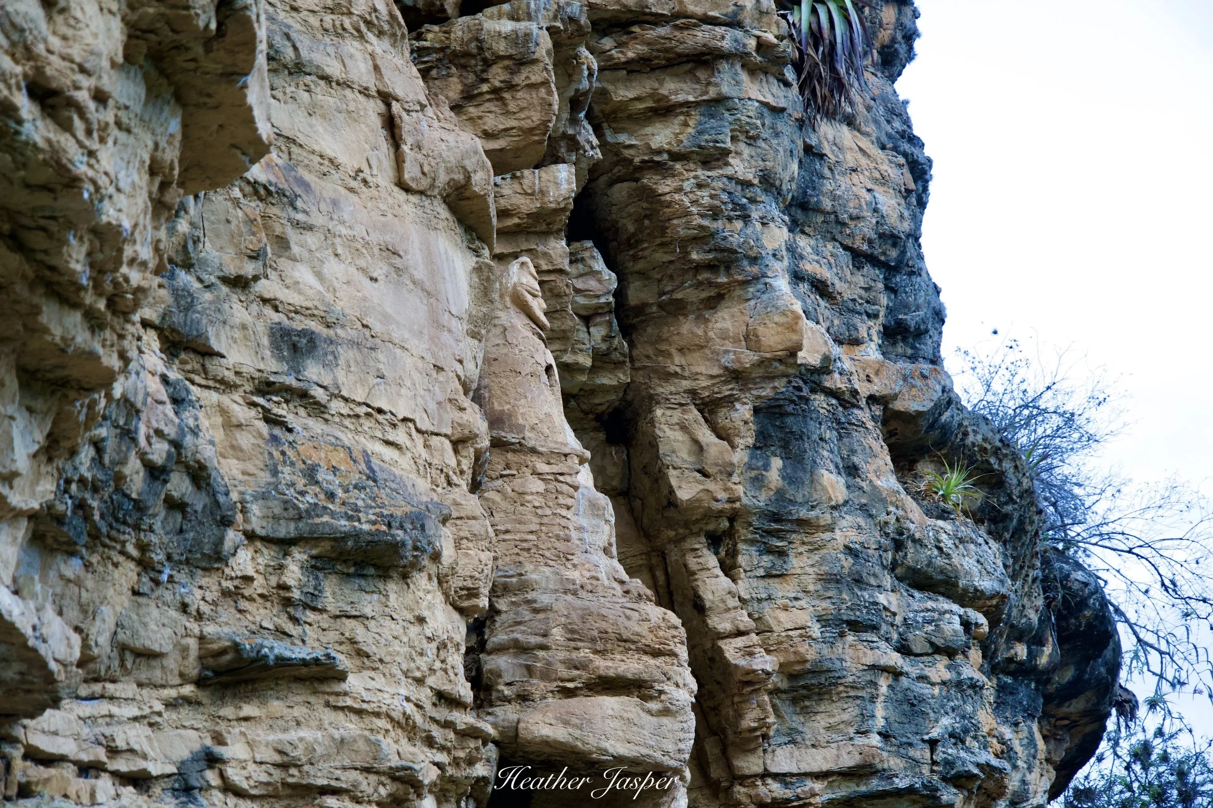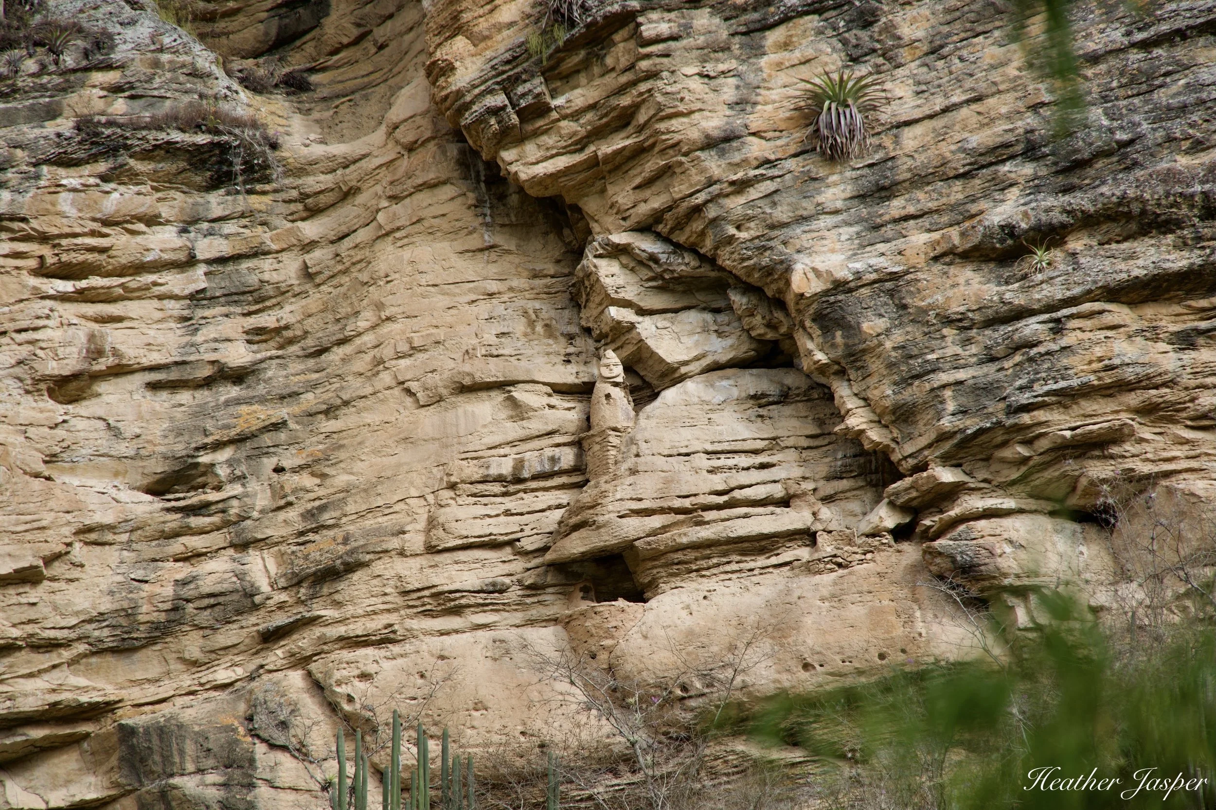 Unfortunately, the sarcophagus at Achamaqui has already been looted. Thankfully, the looters didn’t completely destroy the clay figure on top when they stole the contents of the grave. It’s unpainted, so it blends in pretty well with the cliff behind.