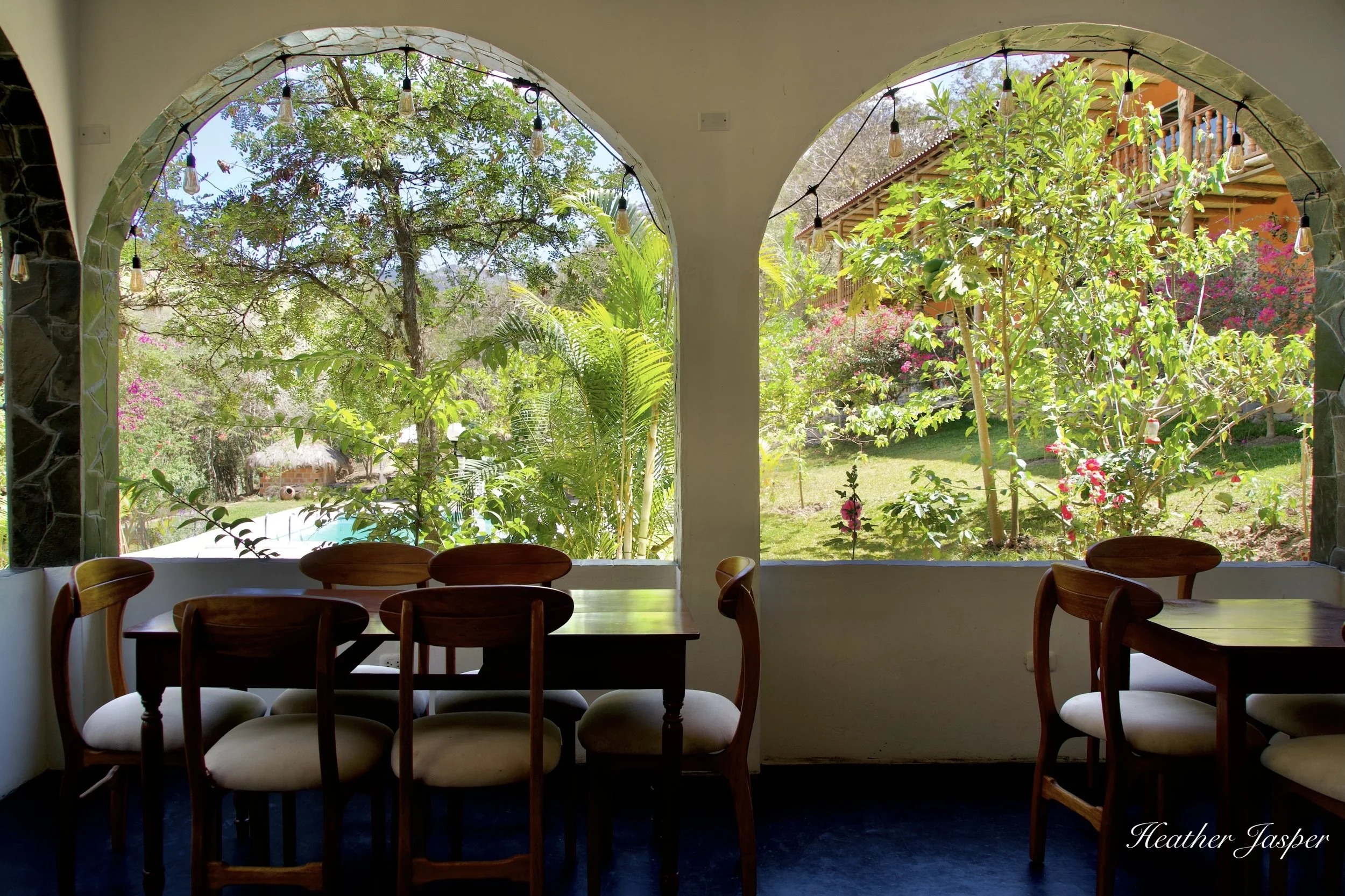 Breakfast is served with a view of the pool and flowering trees full of hummingbirds.