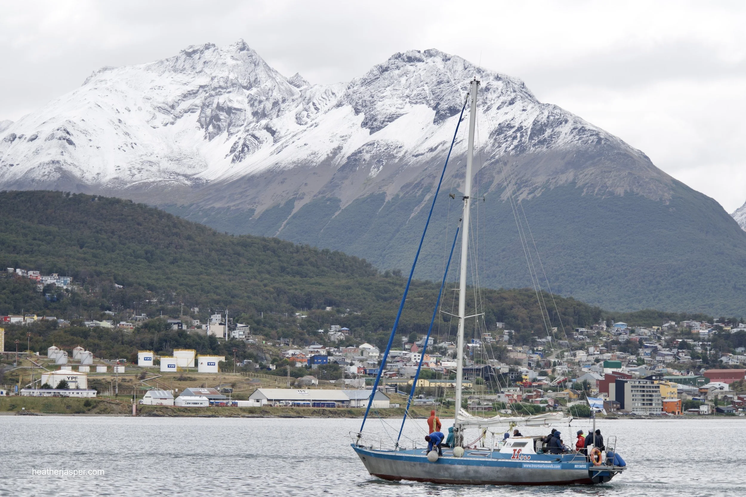 7. Walk past the sunken ship along the malecón to get a picture of the Ushuaia sign with the pointy Mt. Olivia and multi-peaked Five Brothers Mountain in the background.