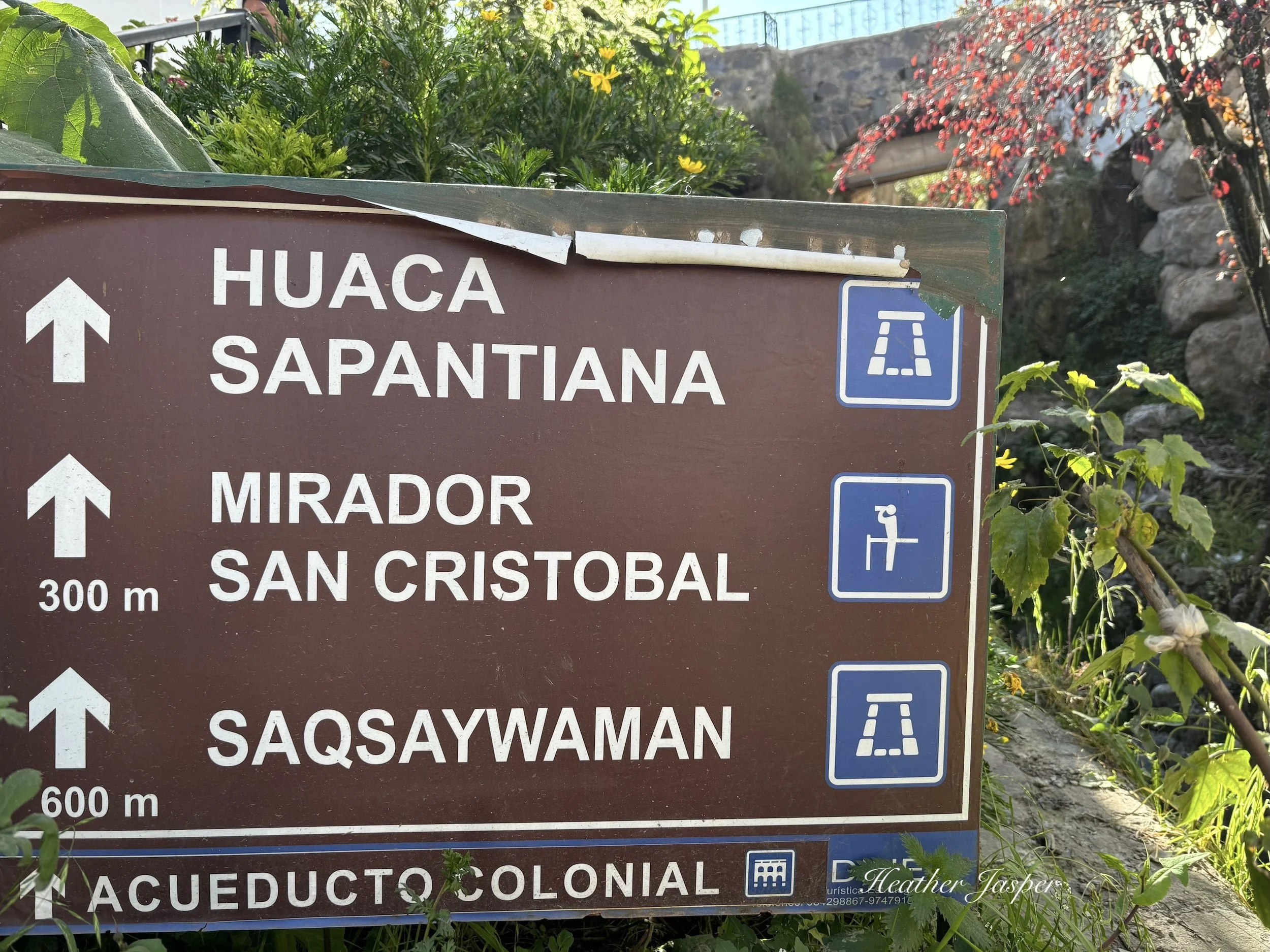 Stand on the downhill (southern) corner of the plaza, facing uphill towards the closest hills. The highest church is San Cristobal, the terraces with a cross are Sacsayhuamán (pronounced sack-sigh-wah-mon) and the white Jesus statue is Cristo Blanco. One of the two city busses that go up there is named Cristo Blanco, the other is Huerto. More on how to make hikes easier with taxis and busses is below, keep reading!