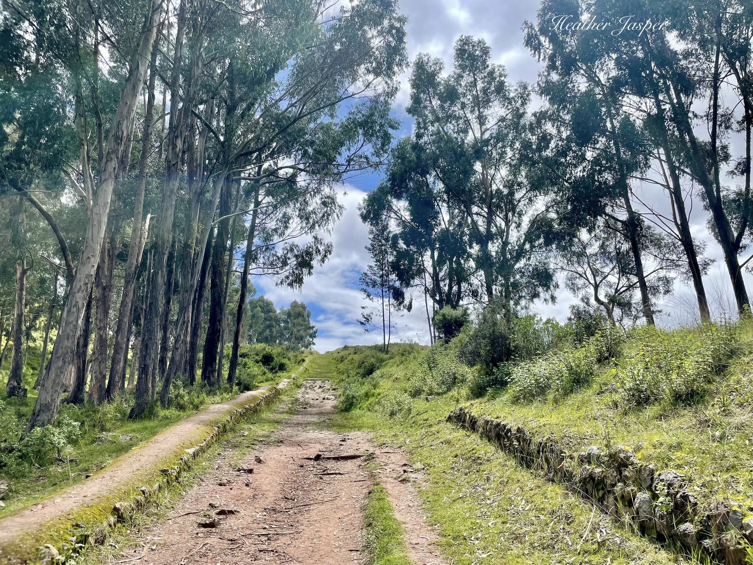 Past the area with steep rocky cliffs on your right, you’ll see Inkilltambo below you and another eucalyptus forest sloping down towards it. There are dozens of trails down through that forest because people graze herds of sheep here and the sheep make trails every which way. Some are more of a scramble than others, but I suggest either the trails on the near side of the forest, or keep going to the other side of the forest because right in the middle is another rocky area with some steep drop offs.