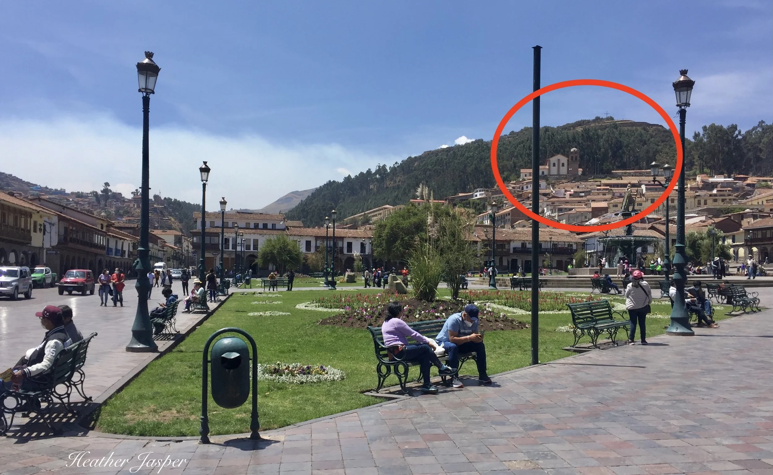 This is the south, downhill corner of the Plaza de Armas. The terraces and cross at the top right are Sacsayhuamán. (Pronounced sack-sigh-wah-mon)