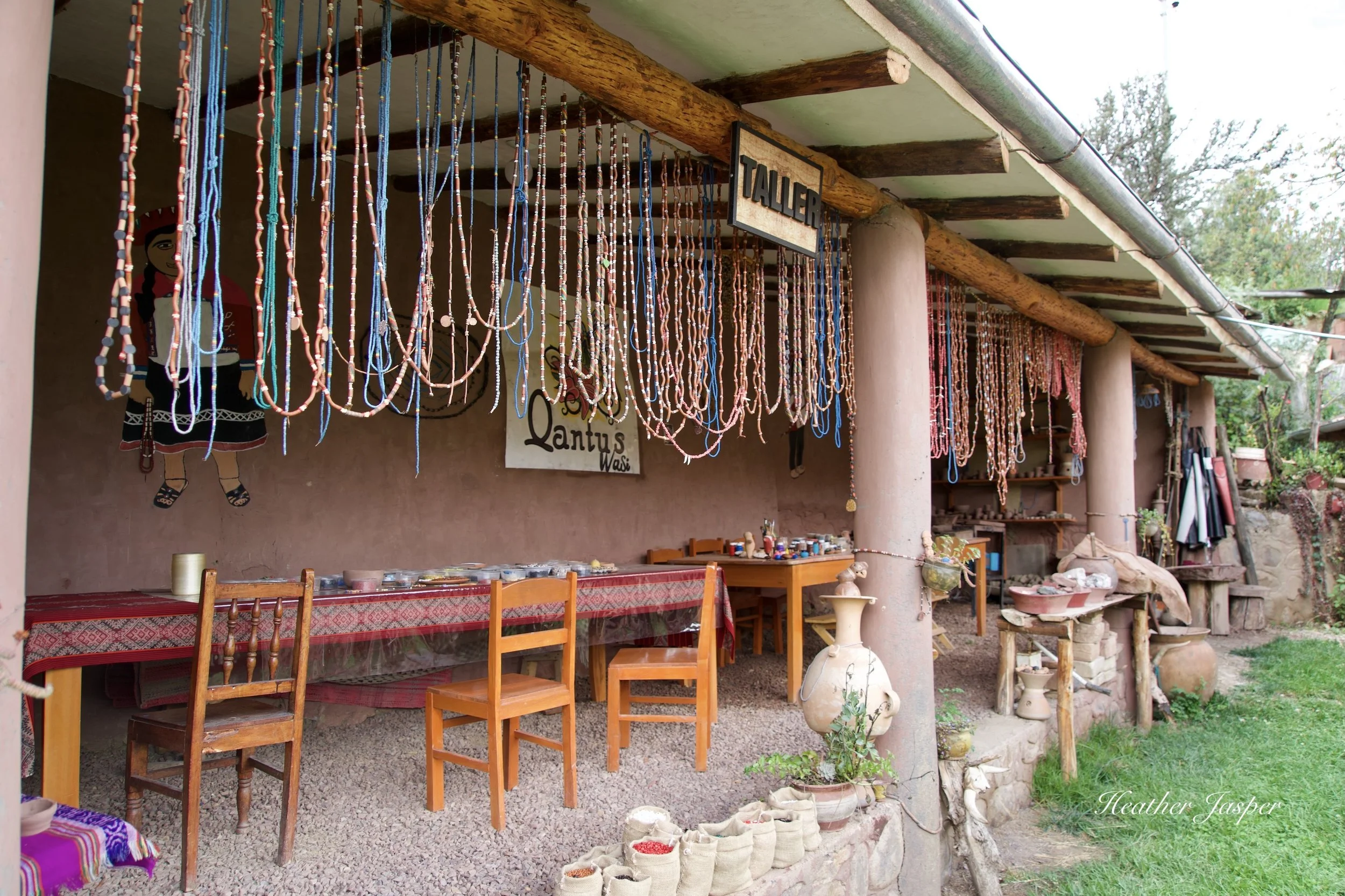 The second activity, after lunch, was to learn about the community’s traditional pottery in their workshop named Qantus Wasi. Since Incan times, and probably before, the families in this area of the Sacred Valley have made ceramics. Renato explained how they gather clay and showed them the natural colors that can be found in the Sacred Valley: red, white, yellow and brown. He showed how they strain and purify the clay, then make beads and dishes with it. Today they have a motor for the potter’s wheel, but Eloy told me that it wasn’t long ago that they had a foot-powered wheel.