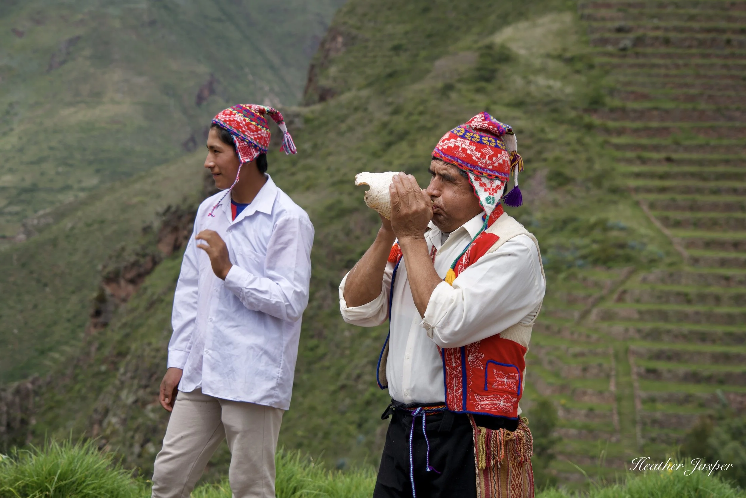 Renato, with the pututu, Faustino and their sons welcomed us to Cuyo Chico.