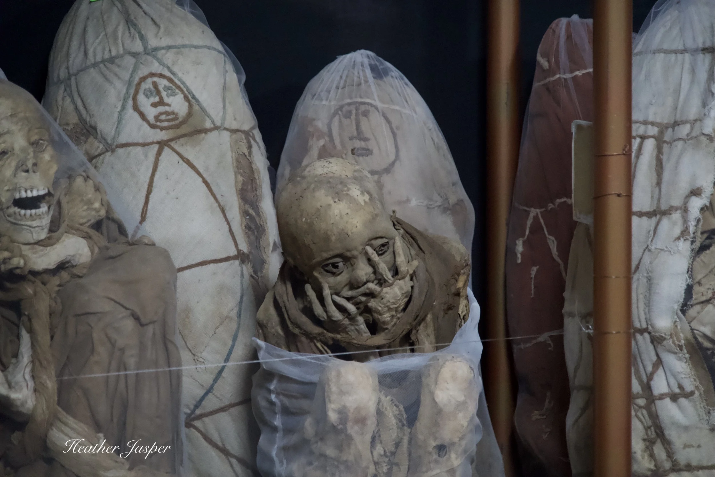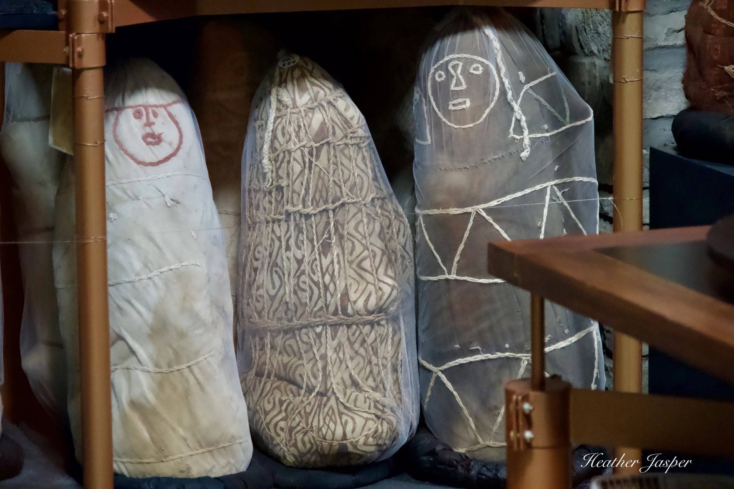 The mummy bundles all have a fine mesh bag to protect the ancient cotton shroud from touching anything.