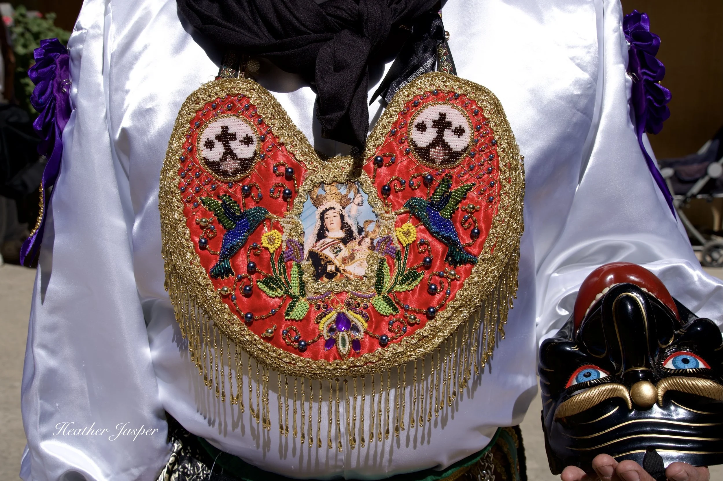 Most of the time, their masks, gloves and costume completely cover every inch of skin. This is because they are playing a role in the festividad, and their character as Qhapaq Negro is what’s important, not the individual behind the mask. Most danzas’ costumes also cover the dancers completely, and the others don’t take off their masks or hats when facing the Virgin.