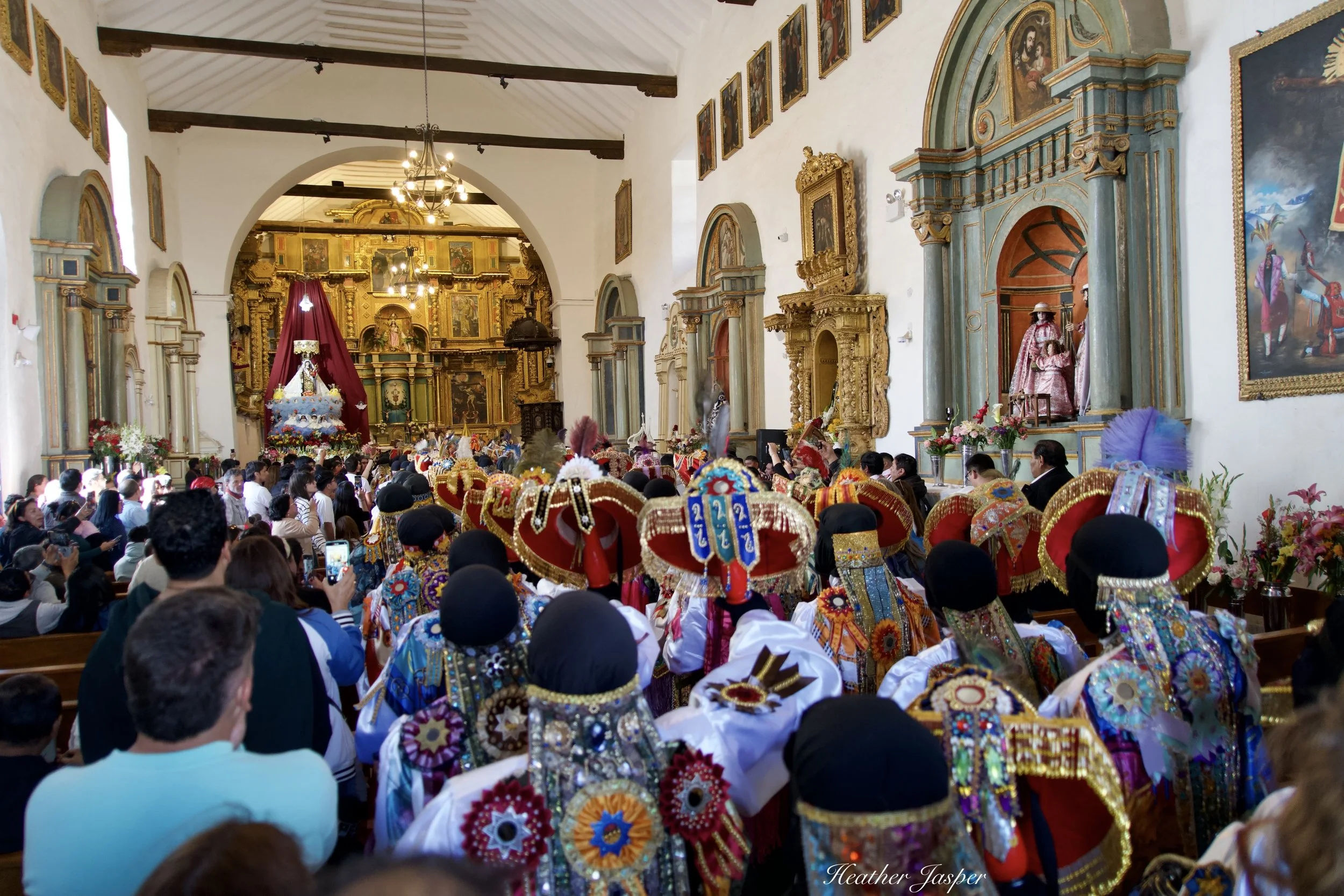 The Qhapaq Negro remove their hats in the church, holding them up on their wooden maki.