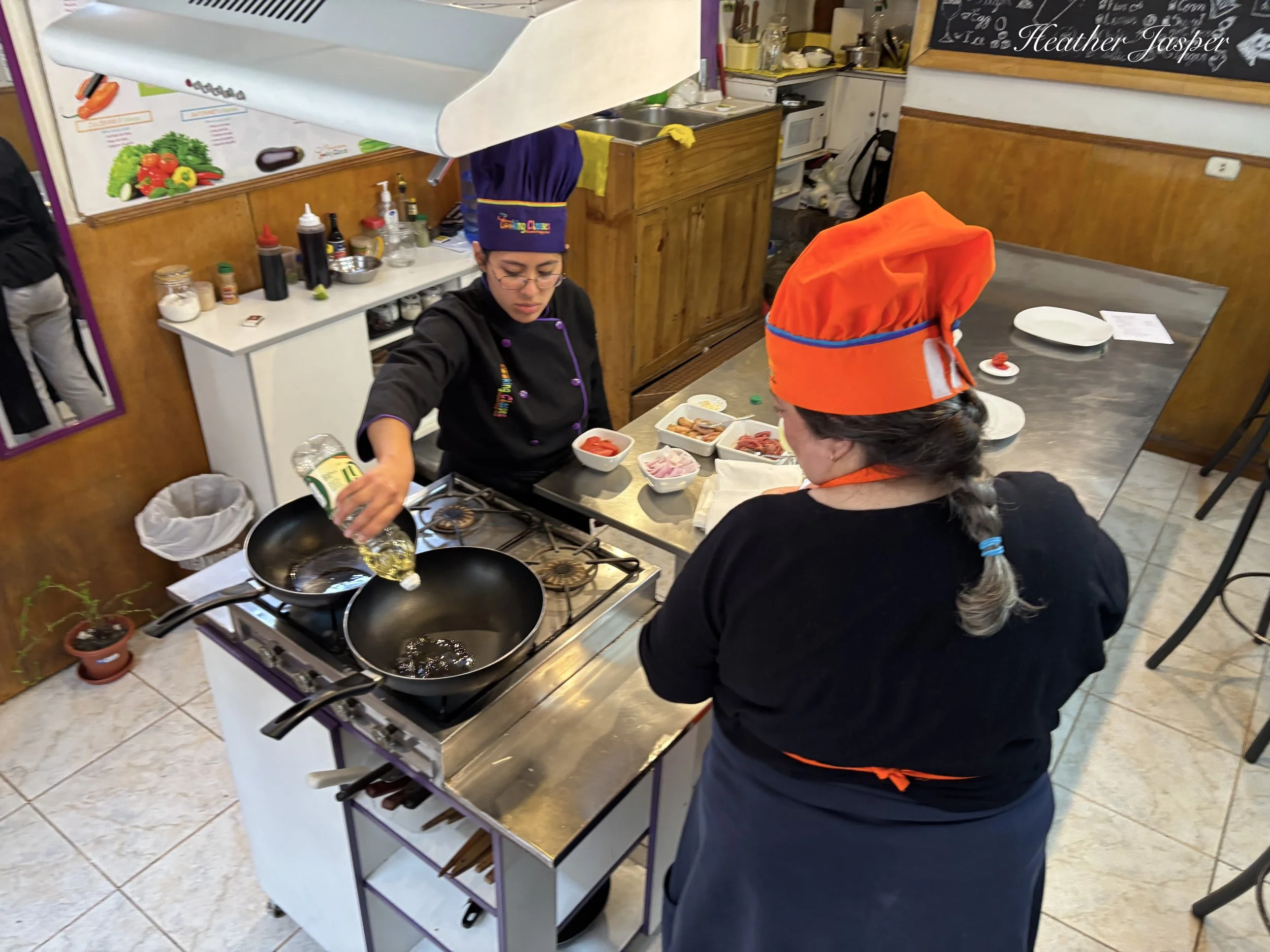 My instructor was Abigail, assisted by Johan and Roxana. We began with a pisco sour, followed by ceviche and lomo saltado. Since I don’t like beef, I asked for a vegetarian version but ended up making it with chicken.