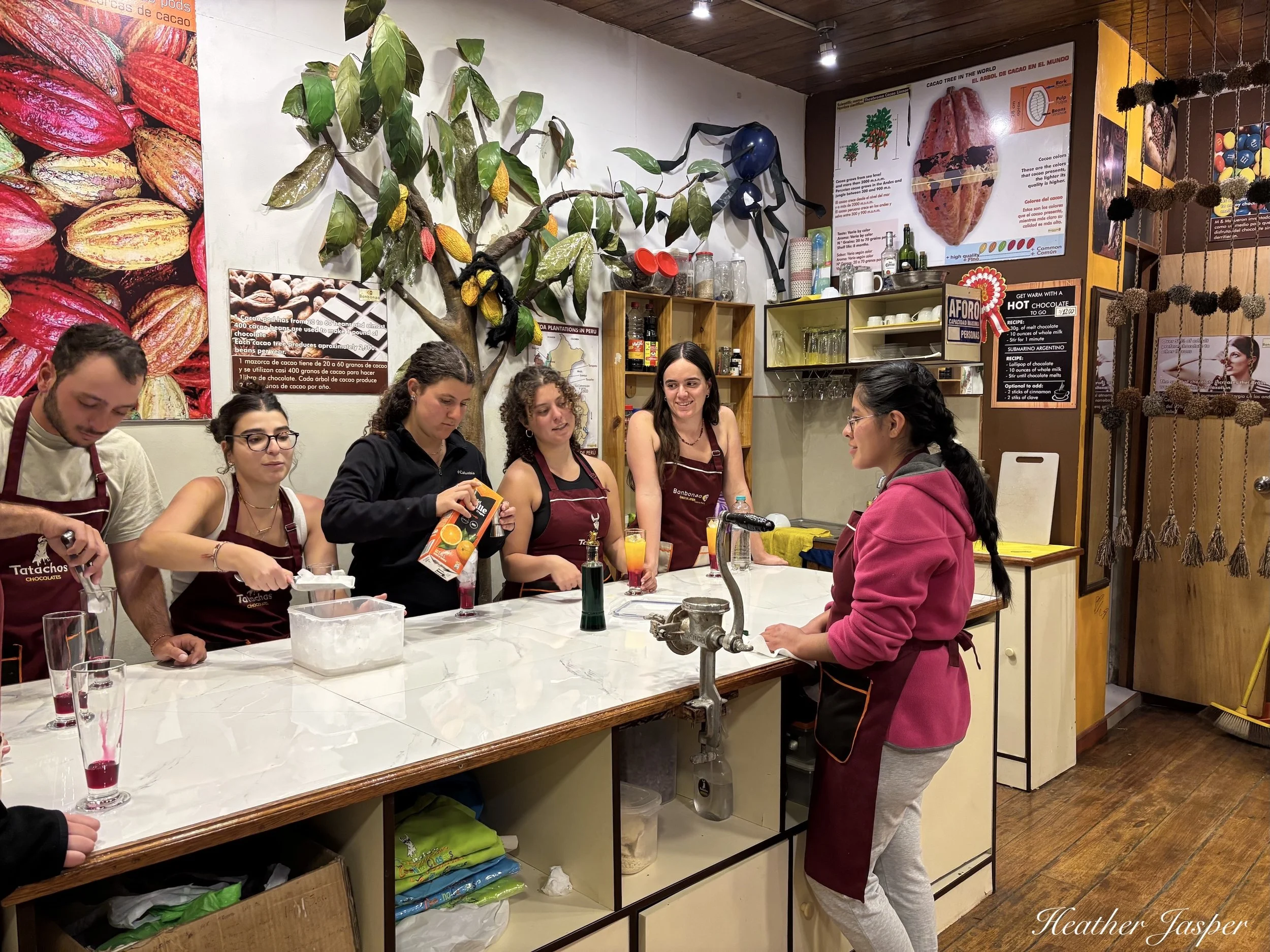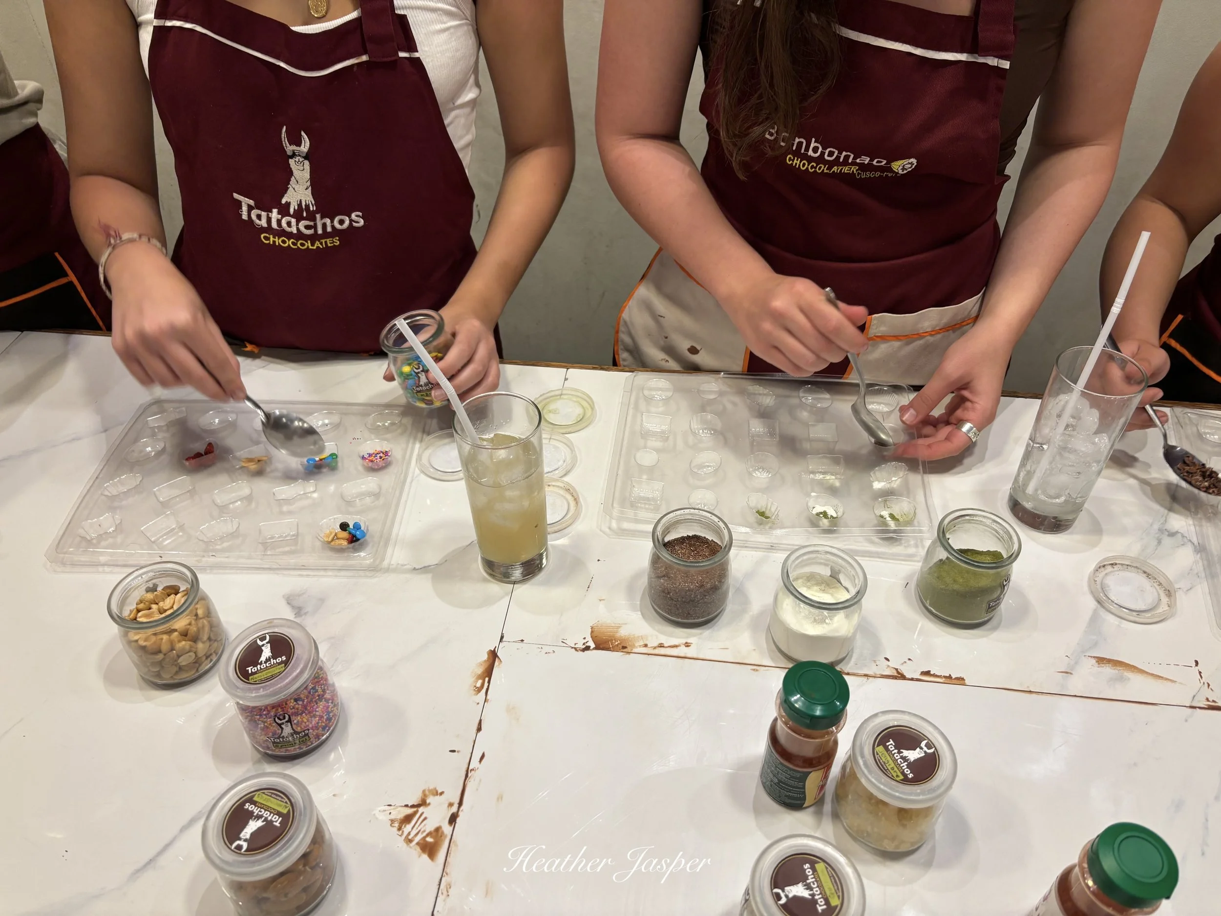 After class, I peeked next door to the chocolate shop where Abigail was leading a cocktails and chocolates class. She first taught them to make a layered cocktail called Machu Picchu, with heavy grenadine syrup on the bottom, orange juice in the middle and mint-flavored pisco on top. The class was a group of seven 20-somethings but it was even too sweet for most of them and only a couple finished it. The second cocktail was a chilcano, another fruity pisco drink but not as sweet and they all finished those while they learned how to temper chocolate. The last part was using the tempered chocolate to make chocolates with an eclectic variety of fillings.