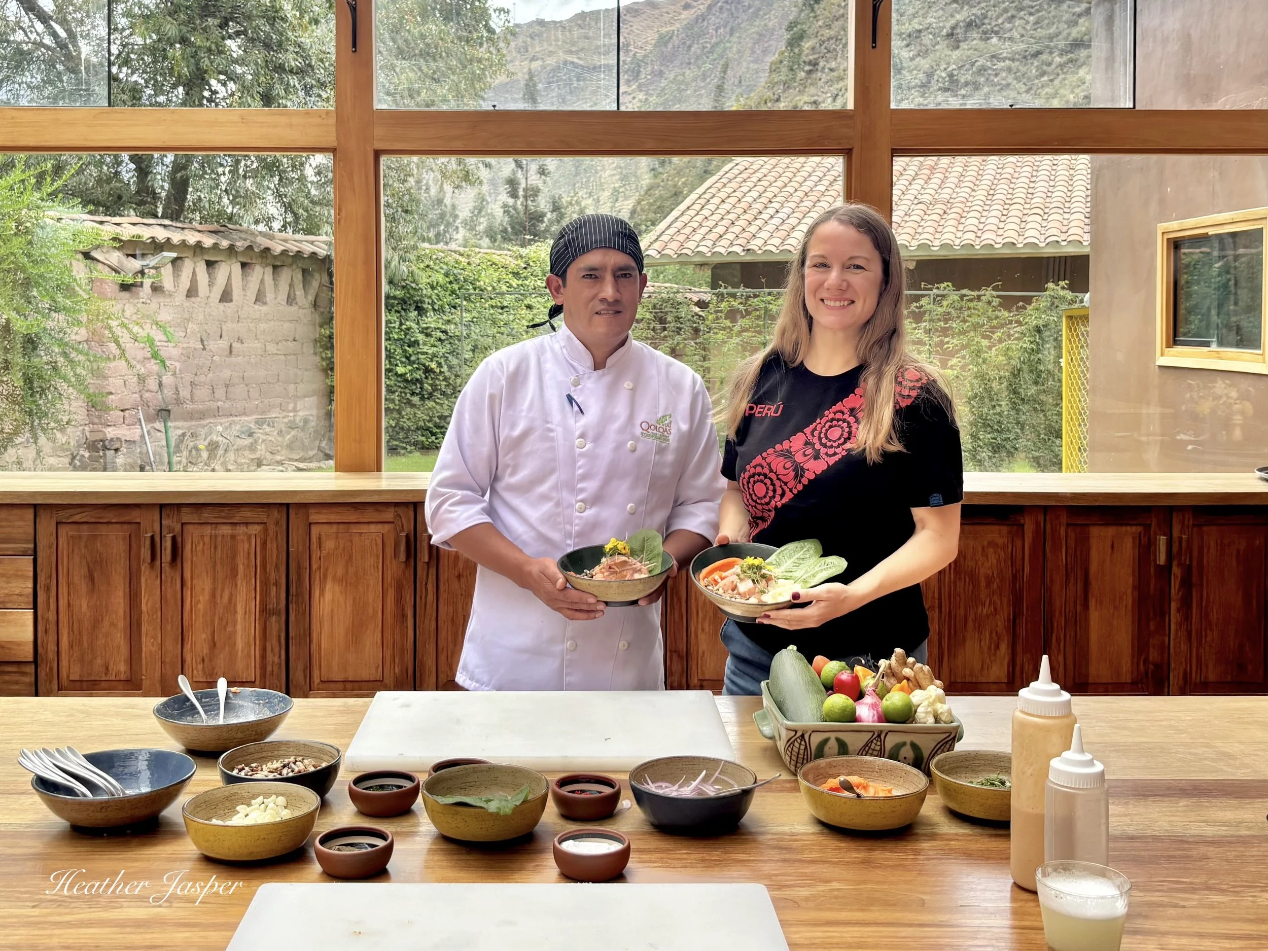 After the pisco sour, the chef, named Lenin, taught me how to make ceviche with trout. The other cooking classes I’ve done taught how to make ceviche with ocean fish but TBH there is no sustainable fishing on Peru’s coast. There are plenty of small trout farms in the Sacred Valley, so eating trout is more environmentally sustainable and supports local families rather than industrial fishing companies.