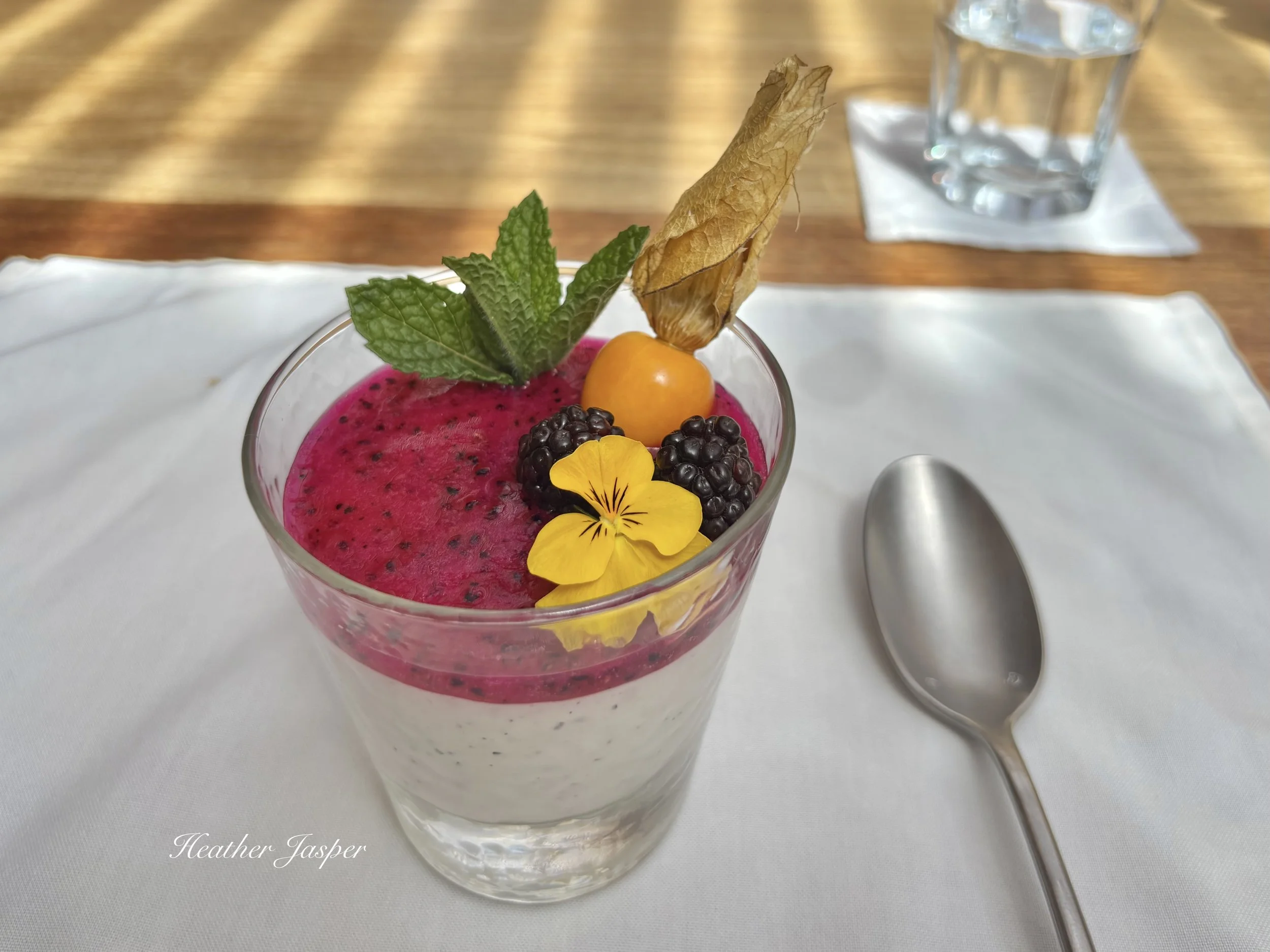 I’m not exaggerating. I’ll try not to gush too much. The texture, flavor and combination of the dessert truly was the best dessert a restaurant has ever served me. (A close second is the wine-poached pear I had at Treehouse Lodge https://heatherjasper.com/peru-blogs-travel-tips/treehouse-lodge). This looked like a traditional Peruvian mazamorra morada with white on the bottom and purple on top, but instead of rice pudding on the bottom, this was a light and foamy mousse made with pitahaya fruit and flavored with wild vanilla. (I visited a family that cultivates vanilla orchids that are native to the Peruvian rainforest in September, and this vanilla came from somewhere similar https://heatherjasper.com/peru-blogs-travel-tips/tingana-nature-preserve-moyobamba). It was topped with a semi-liquid jelly also made of pitahaya, colored with airampo and set with locally grown aguaymanto, berries and an edible pansy.