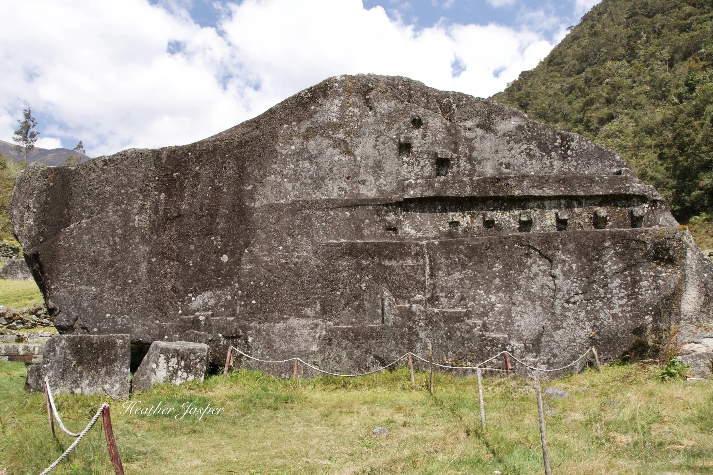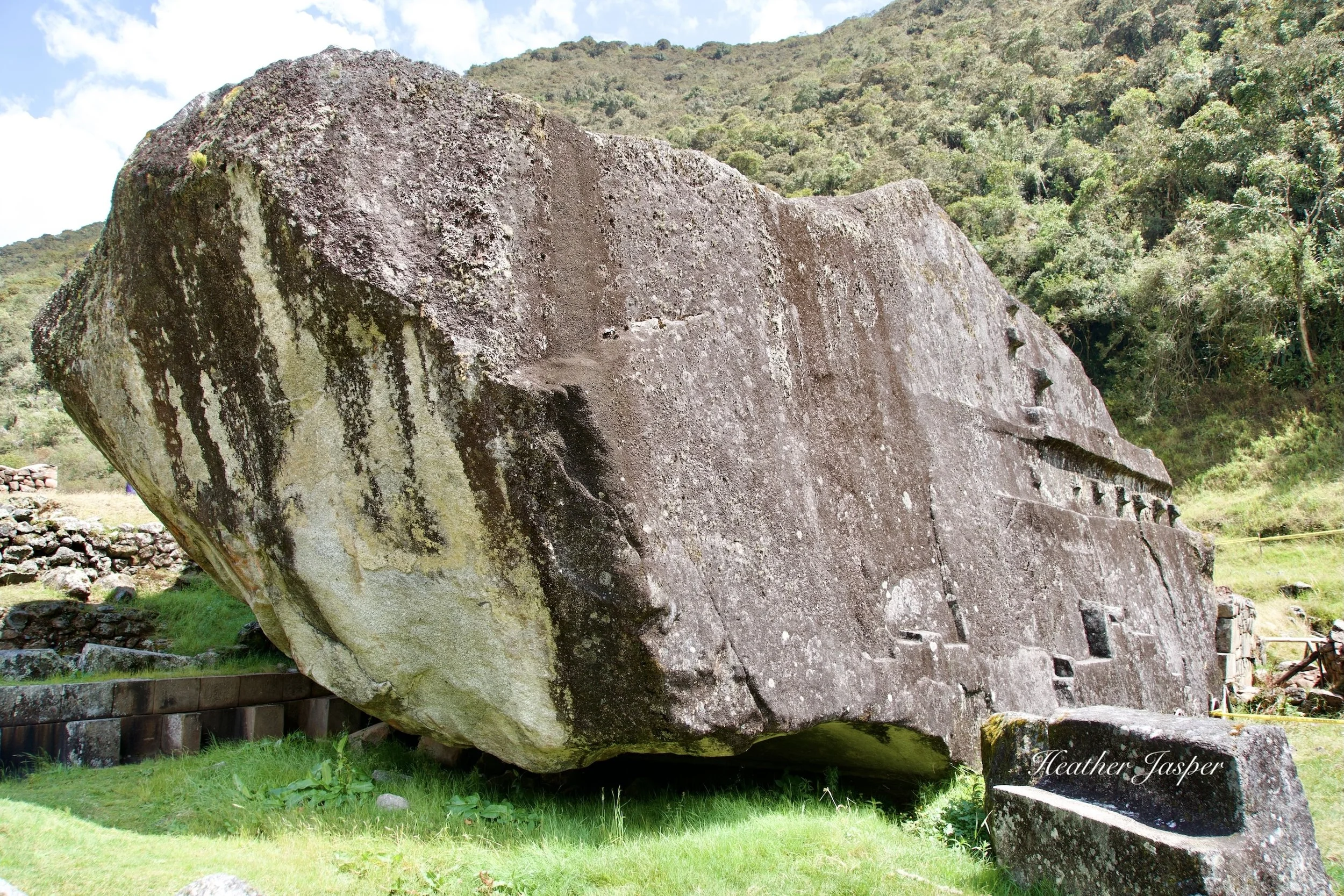 My friend Elisa told me to look for a feline carved into Yuraq Rumi, which I found on one corner. All that’s left is two paws and a faint outline where the head and tail were. The rest was probably destroyed when the Spanish sacked Vitcos. Archeologist Óscar Montúfar explained that though most modern historians call all feline images pumas, the Inca more often used jaguars in their iconography.